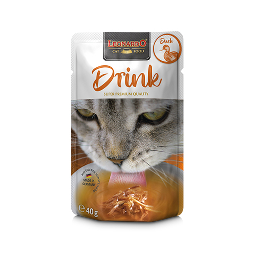 Leonardo Gato Drink Pato es un alimento complementario para gatos adultos, ideal para aumentar su consumo de líquidos. Su delicioso sabor estimula a beber más, ayudando a mantener una buena hidratación y favoreciendo la salud del tracto urinario.